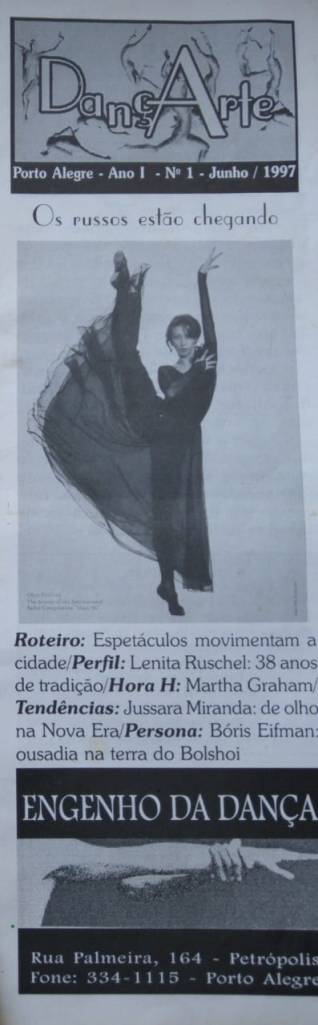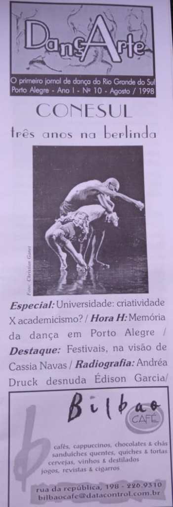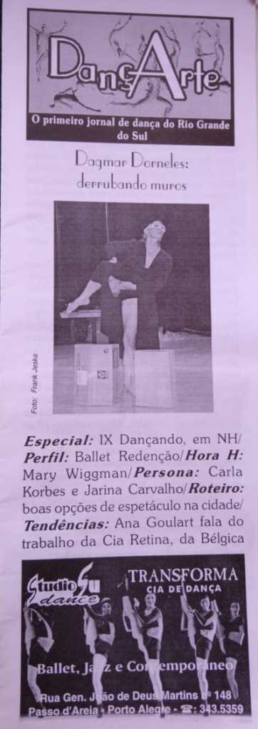 Foi assim que pude entrevistar a grande mestra Dona Tony Petzhold com seis décadas atuação cheia de histórias e a jovem Carla Korbes, com 16 anos, partindo para os Estados Unidos onde foi solista do NYC Ballet e primeira bailarina do Pacific Northwest Ballet, em Seattle. E elaborar matérias de lavar a alma com Dagmar Dornelles e Newton Moraes; os 10 anos do Terpsí; os 38 anos do Ballet Lenita Ruschel; a inauguração de espaços inovadores como do Engenho da Dança, da Jussara Miranda e do Buraco, da Andrea Druck; da continuidade do inestimável Dança Criança, da Leta Etges. E ao mesmo tempo todo interesse na nova cena que surgia com criadores, como a I Mostra de Coreógrafos Contemporâneos de POA em maio de 1998.