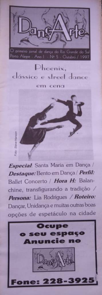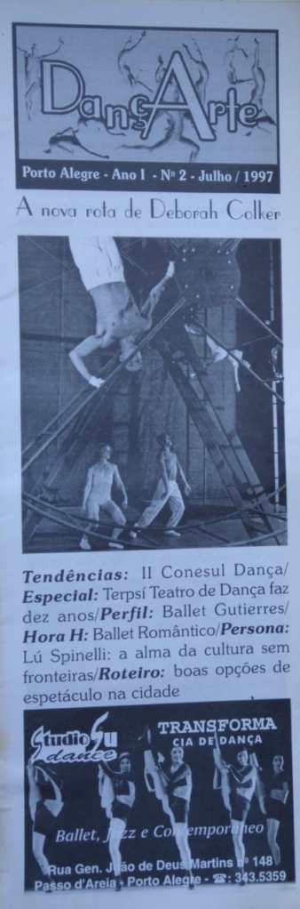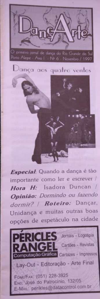 Tinha espaço para o que estava em cartaz, para os eventos (e eram um bocado do ConeSul, o Unidança (da UFRGS), o Encontro Latino-Americano de Dança de Passo Fundo, o Santa Maria Em Dança, o Dançando NH, a Noite do Folclore (Canoas) o Bento em Dança, além dos nacionais como Confort em Dança, Festival Internacional de Dança Bahia Seminário Nacional de Dança de Brasília, ). Tinha história da dança, tinha crítica, tinha entrevista, tinha aviso de audições, informativo de cursos e oficinas. Tinha o perfila das escolas de Balé como Balé Concerto, Gutierres, Ballet Redenção, tinha jazz do Transforma e flamenco do Tablado Andaluz. Tinha espaço para articulação política como da constituição da Comissão Gaúcha de Dança que teve um importante papel naquele momento, inclusive de encaminhamento de propostas para a área ao candidatos ao governo.