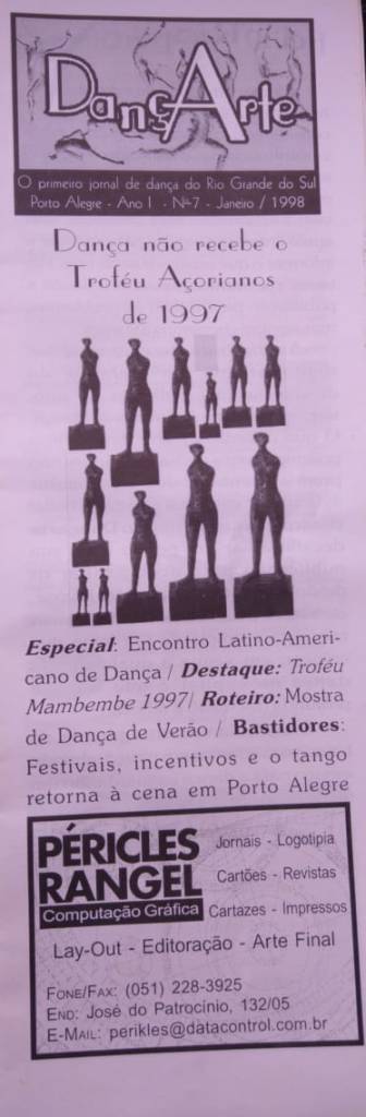Foram dois anos de muito trabalho, de abril de 1996 a agosto de 1998, 11 edições. Por um tempo as assinaturas conseguiram manter os custos de produção do Dançarte, mas logo passou a não ser suficiente pois tínhamos de abrir mão de outras atividades pra trabalhar de graça, e as edições foram se esperando. Mas foi um período que creio que o Dançarte deu sua contribuição e colaborou na formação em tempos que não se tinham site, nem blogs, nem espaço na televisão e jornais. Uma ação recheada de um bocado de idealismo que nunca abandonamos e essa energia foi canalizada a novos desafios que surgiam na cena da dança gaúcha. Gratidão a todxs que assinaram e o ajudaram a manter, a todxs que leram e dançaram por suas páginas.