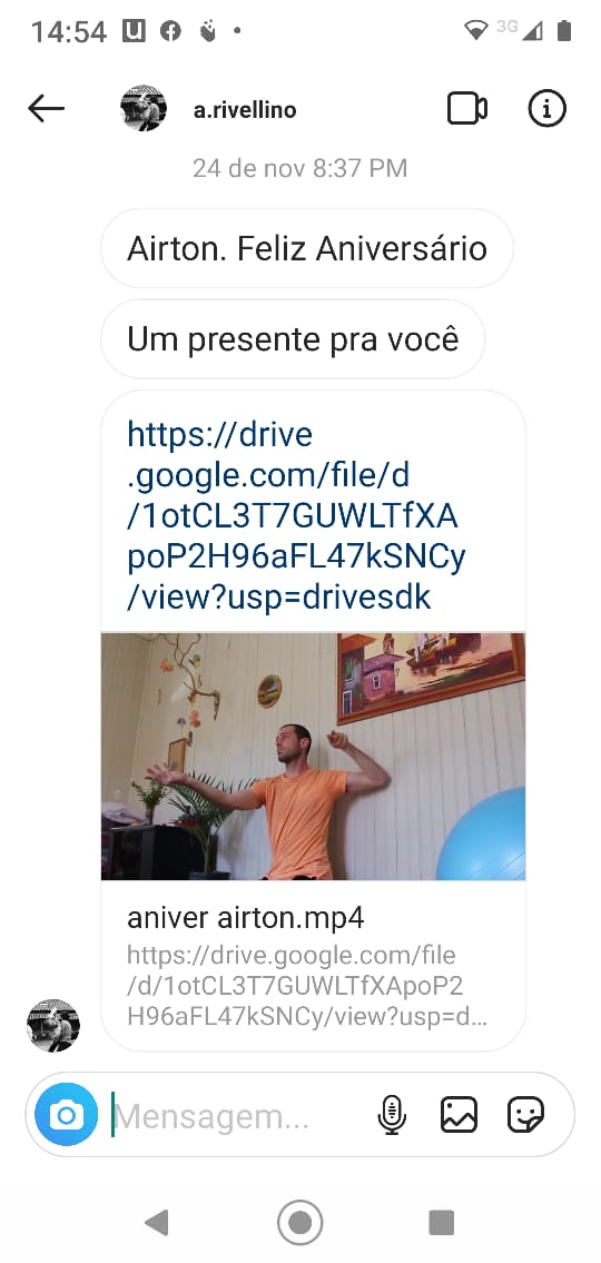 A dança que recebi do Alessandro tem dessas novas condições que a conexão on line trouxe. Quando espero entre tantas mensagens nas rede sociais do dia do aniversário mais uma felicitação, ela vem com um link. E eu que até então estava resistindo me permito algumas lágrimas de felicidade. E vi e revi inúmeras vezes e me exibi como quando a gente espalhava os presentes por sobre a cama. E então ficou como aquelas preciosidades que a gente guarda naquela caixinha com fotos, cartões, cartas, recortes. Está lá pra gente revisitar. E que delícia essa modalidade também para memória que prega peças na gente.