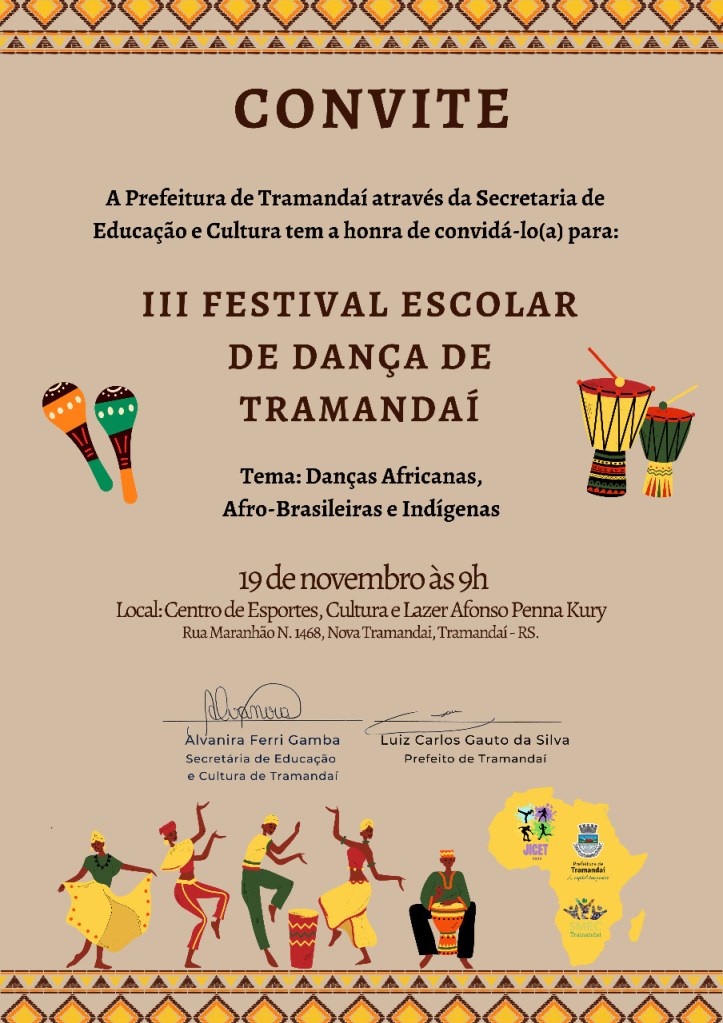 Manhã ensolarada de um sábado com calor e mar de águas claras. Dia perfeito para curtir a beira mar e o que se viu foi um ginásio cheio de estudantes para apresentar e ver danças e na véspera do dia da Consciência Negra. Danças que tratavam da diversidade e identidade cultural do nosso país e da região. Foi assim o 3° Festival Escolar de Dança promovido peal Prefeitura de Tramandaí, por meio da Secretaria de Educação e Cultura no sábado, dia 19 de novembro, no Centro de Esportes, Cultura e Lazer Afonso Penna Kury – Ginásio da Nova Tramandaí. O evento teve como tema as danças Africanas, Afro-Brasileiras e Indígenas e contou com a participação de onze grupos de dança de escolas municipais e estaduais. Estive no júri junto com os artista/educadores mestre Ivan Therra, Lizzi Barsosa, Tati Missel, Juliana Ludwig e e a empresária Juliane Dullius.