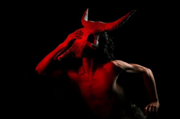 O espetáculo inicia com duas figuras masculinas mascaradas e de torsos nus. As faces estão cobertas por uma caveira de boi, vestem calças coberta de farta pelagem animal e os pés são um grande parte de cascos com os quais trafegam por um palco coberto de terra preta. Se instaura de largada um território mítico, do universo rural e campeiro que marca a cultura do Rio Grande do Sul, mas que também remete às figuras mitológicas gregas dos faunos. Aliás, a dança produziu outra potente obra criada por Nijinsky em 1912, “L’Après-midi d’un faune / O entardecer do fauno” e o que traz um contorno histórico e estético ainda mais bacana para a obra em cena. De alguma forma estão ali esses faunos que flanam pelo imaginário da dança e que se atualizam de alguma forma naquelas figuras que cantam os versos infantis de “boi, boi, boi da cara feia” enquanto desenham no chão, em que se aproximam e afastam, se tocam com receio.