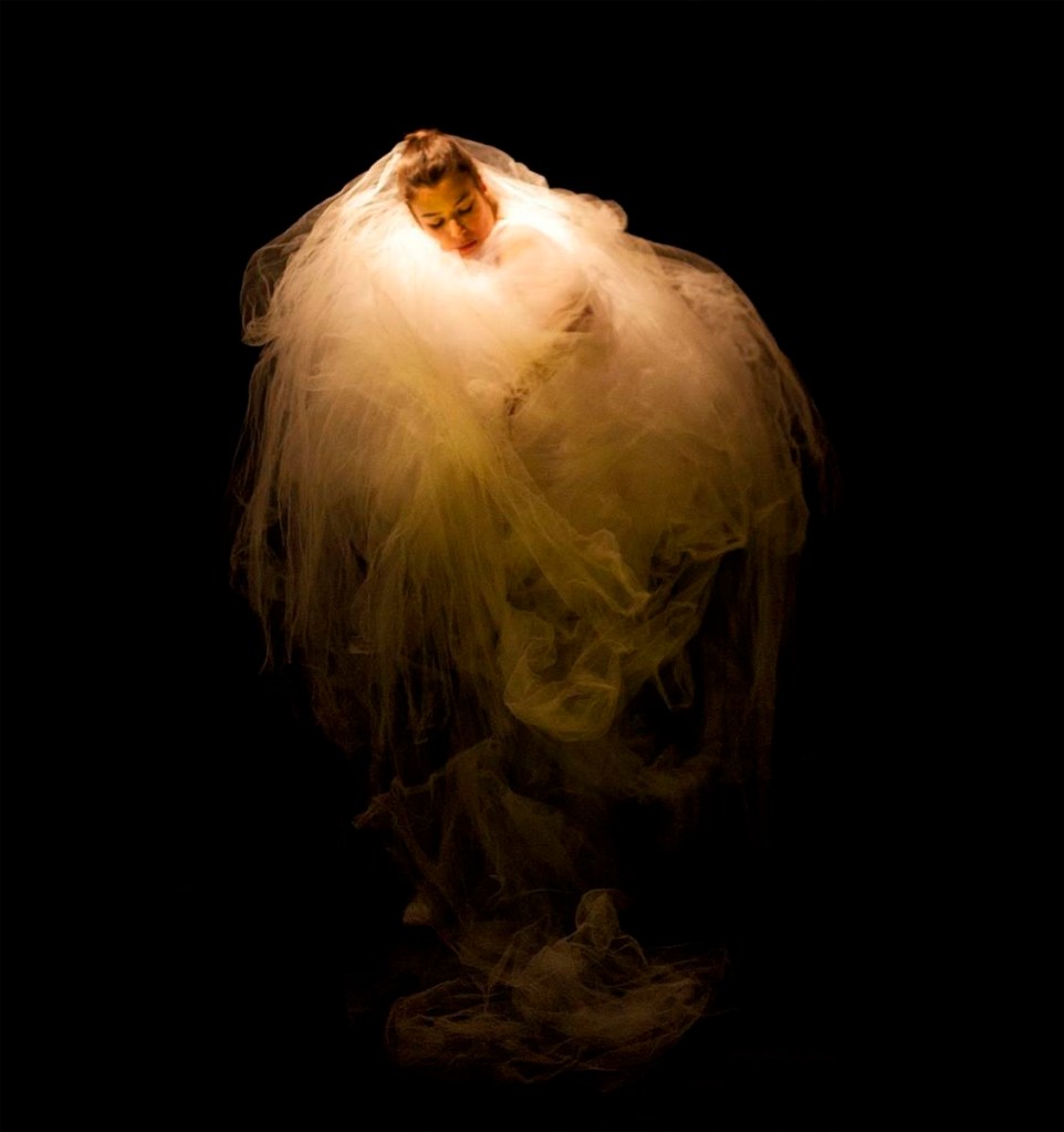 A obra tem muitos acertos e por isso sua importância de estar na programão do 30º Festival Porto Alegre em Cena. Na abertura já temos a plasticidade da figura envolta em uma amontoado de tule branco, típicos das saias da bailarinas clássicas romântica. Só que não temos o efeitos original desse traje, chamado de tutu, que tinha o objetivo de criar a ilusão de um corpo que flana pelo espaço, vencendo a gravidade. Aqui temos a bailarina dentro desse volume que esconde boa parte do seu corpo e movimento e que se adensa ao seu redor. Contudo ainda persiste ali uma suavidade de quem parece poder embalar finalmente seus sonhos e encontrar outros imaginários para sua dança. E isso envolto numa sonoridade dissonante, ruidosa, nada melódica. Está anunciado o descompasso dessa frágil dança.